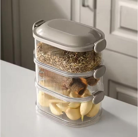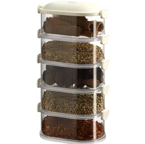 Idéales pour les cuisines souvent petites ou pour gagner du temps et de l’espace, ces boîtes vous offrent 3 , 4 ou 5 niveaux de rangements différents tout en 1 seul contenant compact. Grâce à ses joints hermétiques , vous pouvez combiner jusqu'à 5 boîtes de rangement en 1 seul , ce qui fait gagner de l’espace et du temps . Avec cet outil , vos épices sont à portée de main et bien organisées dans l’armoire.